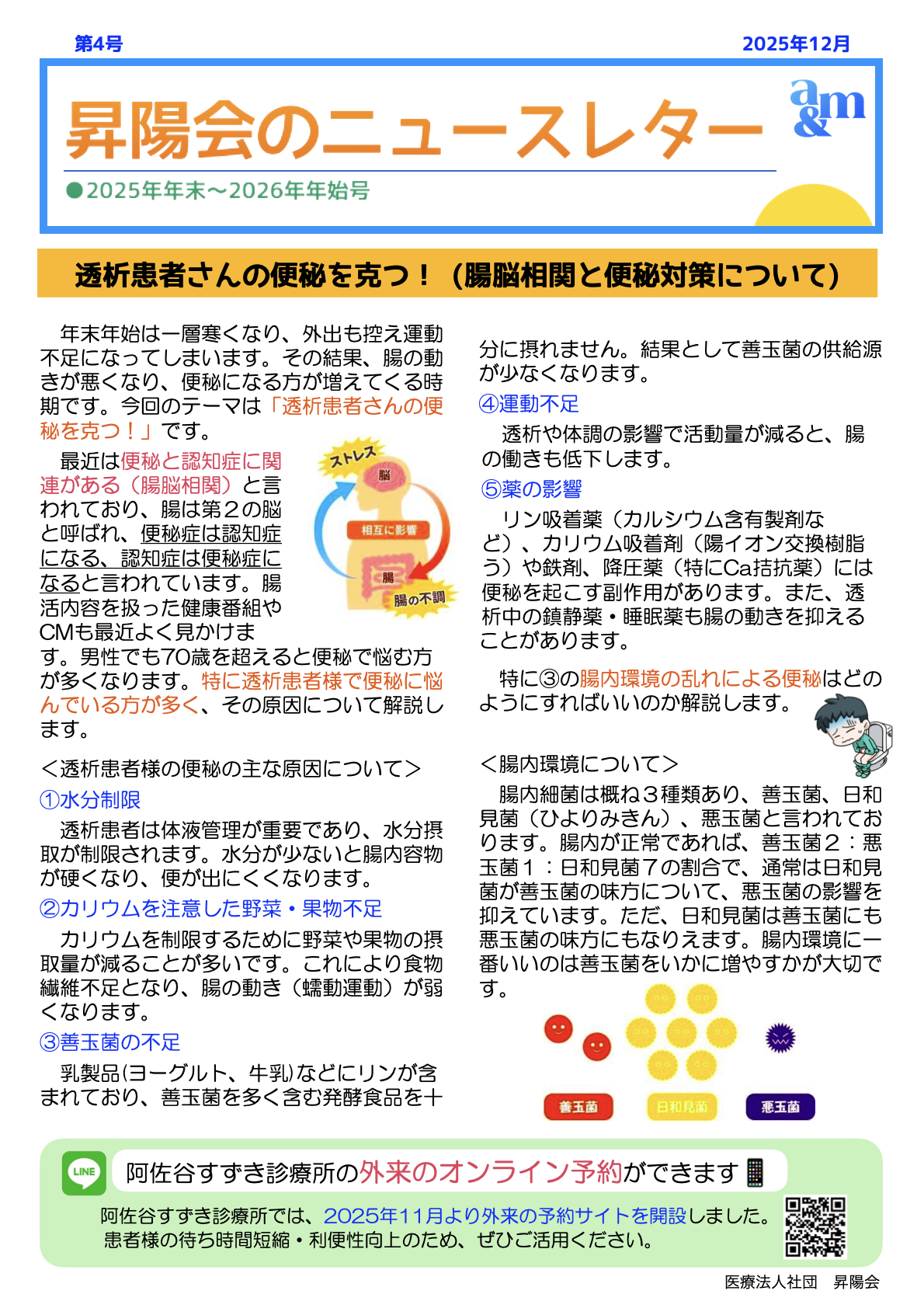 昇陽会のニュースレターの第4号が創刊されました!今回は透析患者さんの便秘についてです。ぜひご覧ください!